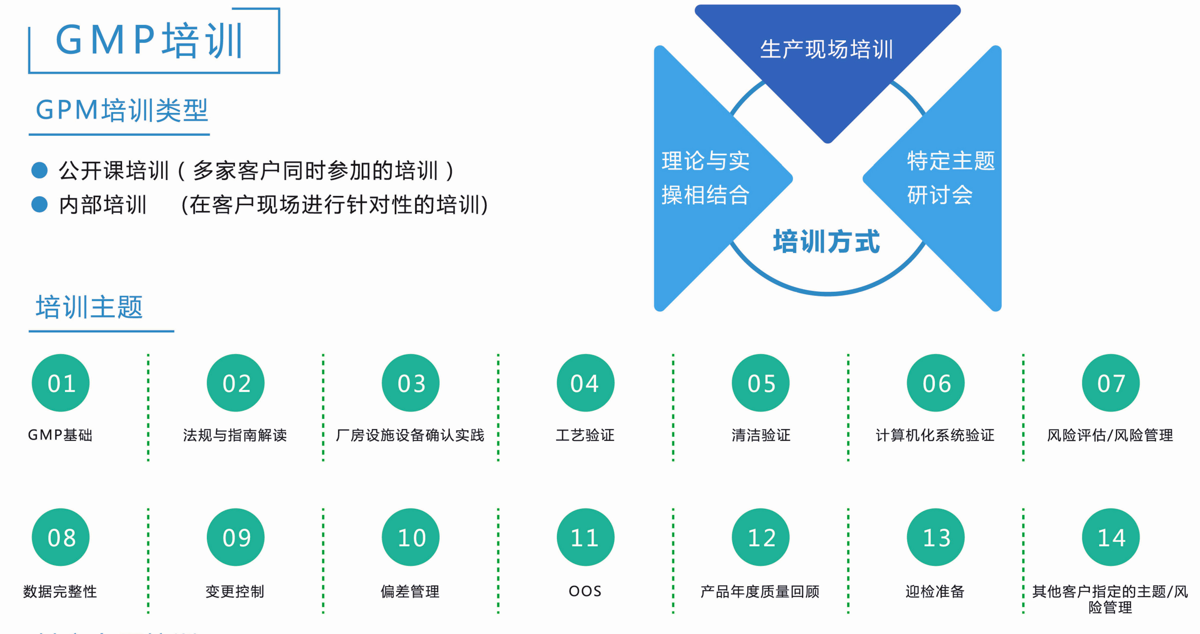 GMP培訓主題 GMP基礎、法規與指南解讀、廠房設施設備確認實踐、工藝驗證、清潔驗證、計算機化系統驗證、風險評估/風險管理、數據完整性、變更控制、偏差管理、OOS、產品年度質量回顧、迎檢準備、其他客戶指定的主題/風險管理