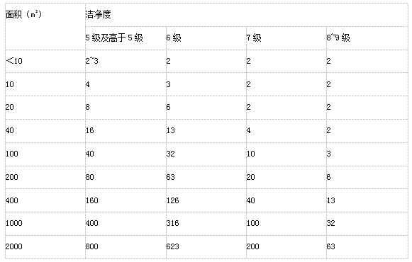 A————被測(cè)對(duì)象的面積(m2);對(duì)于非單向流潔凈室,指房間面積;對(duì)于單向流潔凈室,指垂直于氣流的房間截面積;對(duì)于局部單向流潔凈區(qū),指送風(fēng)面積。